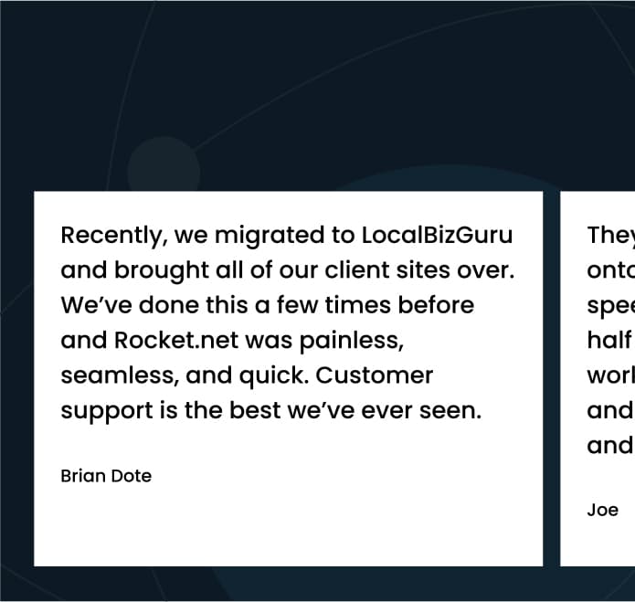 By switching over to Rocket.net, you’ll experience immediate improvements in speed, performance and security across all of your websites. The process is seamless, typically takes under an hour and we take care of everything. Best of all, you get to test and benchmark the site prior to switching your DNS.